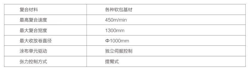 無溶劑復合機主要結構特點:1.收放卷:可實現無軸雙向收放材料,并采用了通過歐洲進口的直流母線運動控制器控制,有效的保證了張力控制的穩定性與高精度;無溶劑復合機涂.............